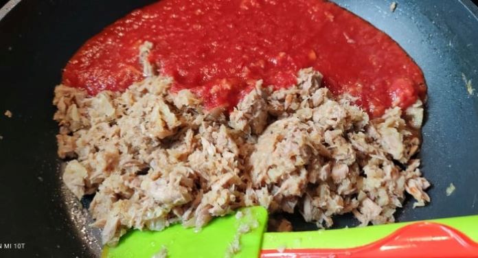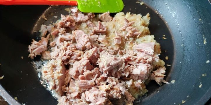 Am adaugat tonul din conserva, cu tot cu ulei. L-am amestecat cu ceapa si am lasat sa se imbine gusturile. Am mai adaugat putin ulei, tonul fiind foarte uscat.